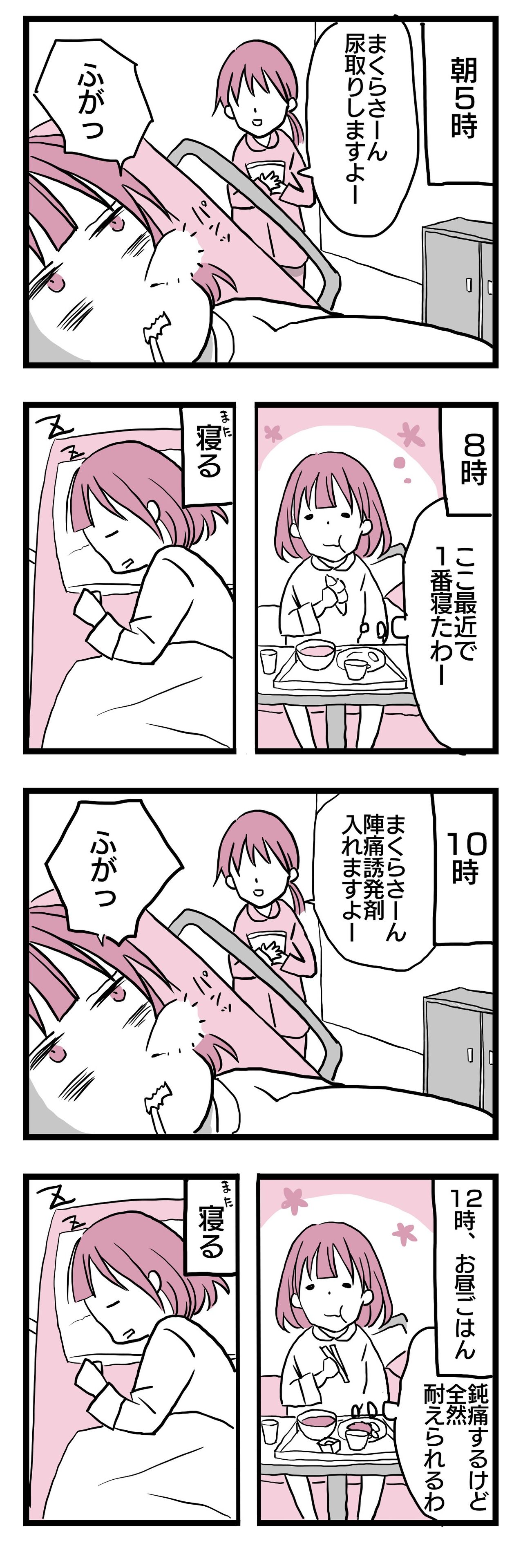 入院中産むまでは妊娠してから1番よく眠れました。(麻酔のおかげ?)とにかく眠くて眠くて。つわりの気持ち悪さより眠気が勝ってめっちゃ楽でした。吐きづわり中は寝てる時が唯一楽な時だったので点滴に睡眠薬入れて下さいって言ってた事思い出してました笑(もちろん断られた)