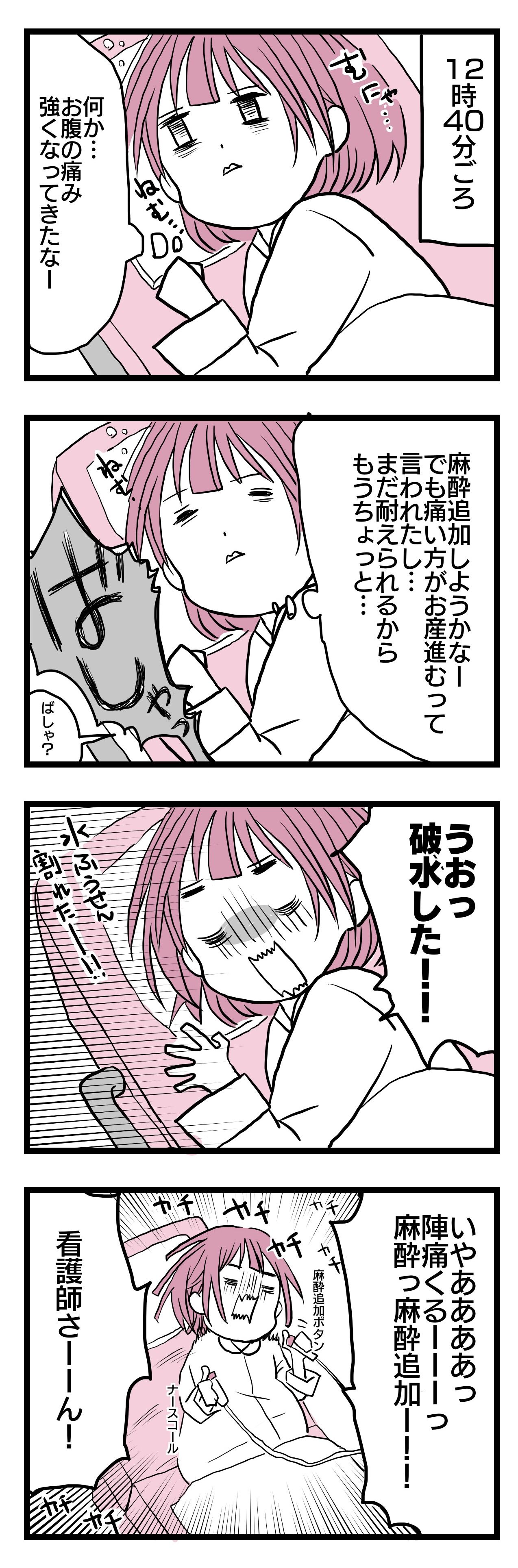 麻酔は自分でボタンおして追加出来ました。一回打ったらその後数十分は打てないのでどのタイミングで打つか考えてましたねー。打つのが遅くて陣痛激しくなった時耐える時間が長くなるのも嫌だし早く打ちすぎて産む時切れるのも怖い。