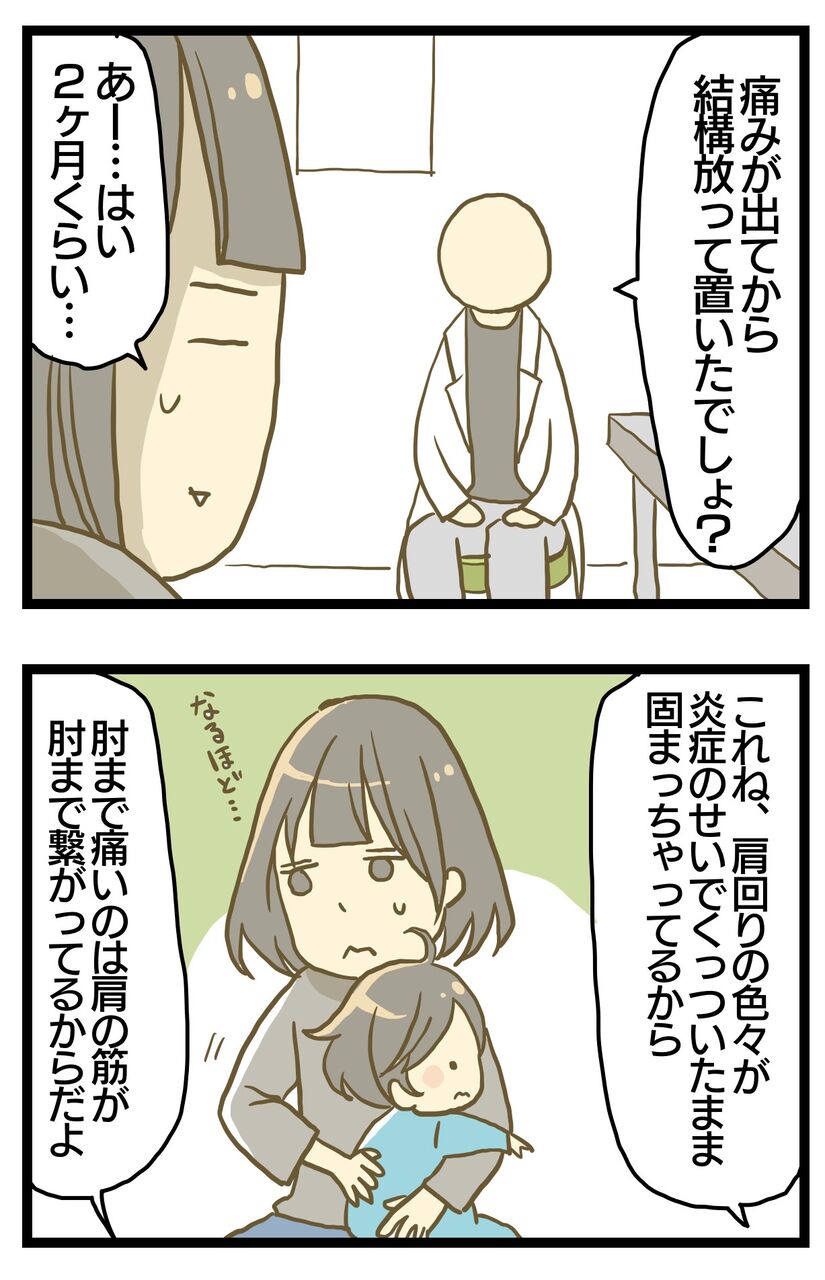 ワンオペ育児の通院事情⑥ 2022年03月10日 週1って!?え?そんなハイペースで通うんですか!?五十肩で!?てか2個目の治療法怖っめっちゃ物理!?リハビリは肩周りがほぐれてきたら通院の回数へらせるけど最初は間を開けずに通った方がいいとのことでした。※あくまで私の場合です最初から読む方はこちら 前のお話はこちら 次のお話はこちら 妊娠悪阻で生き地獄な妊娠話はこちら 母乳ミルク問題はこちら 寝る赤ちゃんはこちら ワンオペ育児で夫と喧嘩した話はこちら 義実家帰省愚痴日記はこちら たまおのつかまり立ち奮闘記 「育児絵日記」カテゴリの最新記事 タグ :#育児絵日記#漫画#実録漫画#コミックエッセイ#通院 < 前の記事次の記事 >
