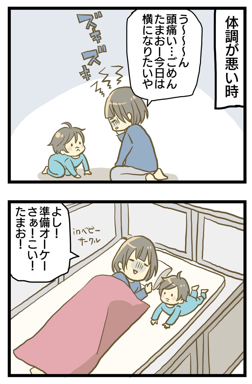どうしても辛い時はベビーサークル内で横になってます。たまおも母を登ったり鼻むしったり目潰ししたり鼻の穴に手を突っ込んだり楽しそうに涎をまきちらして遊んでくれます。