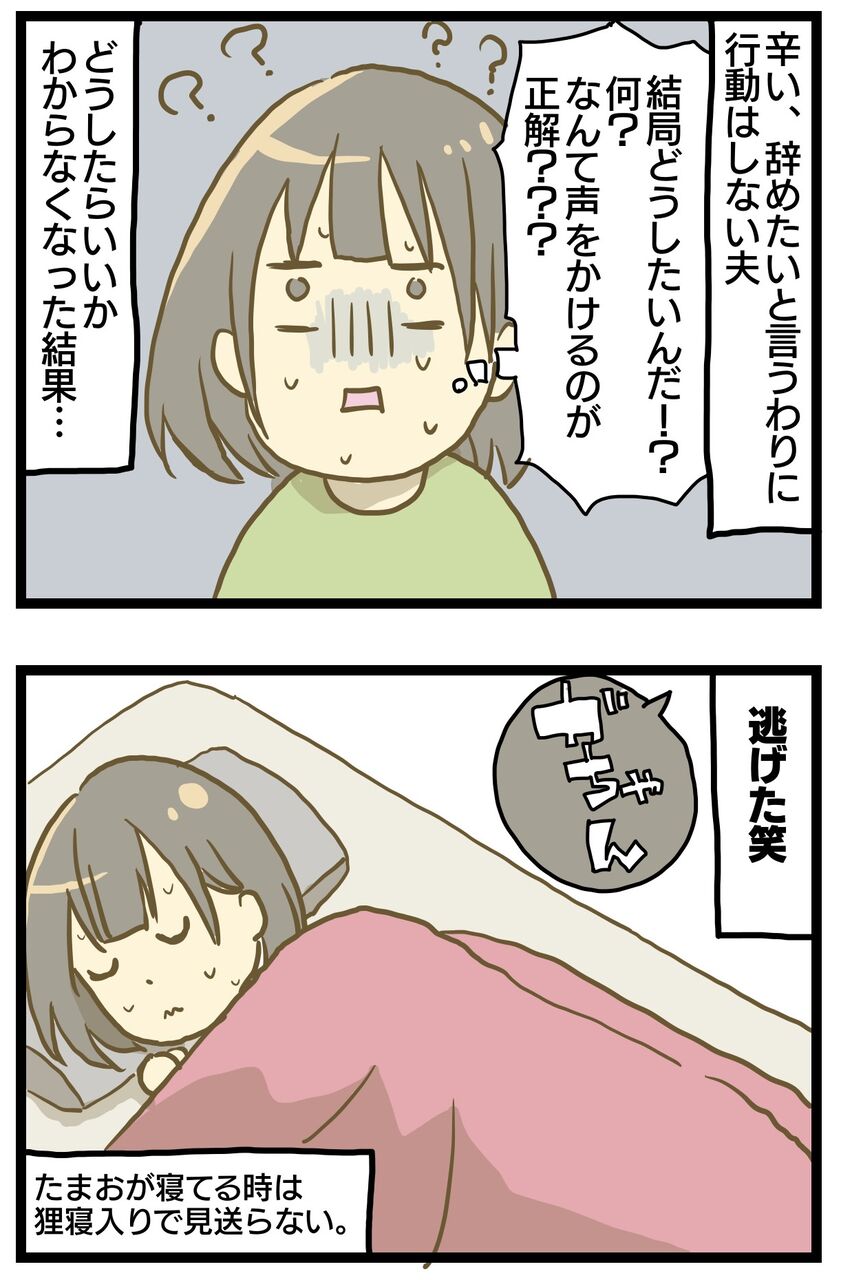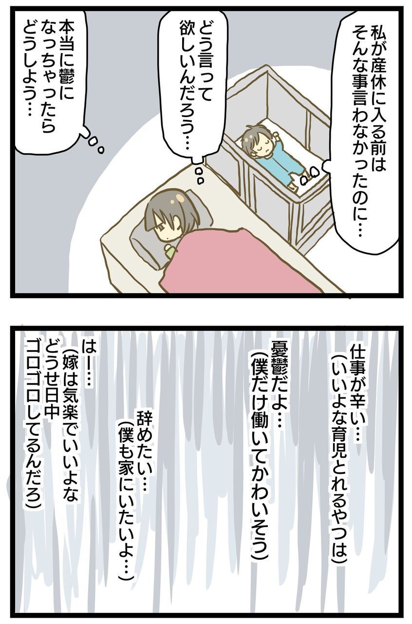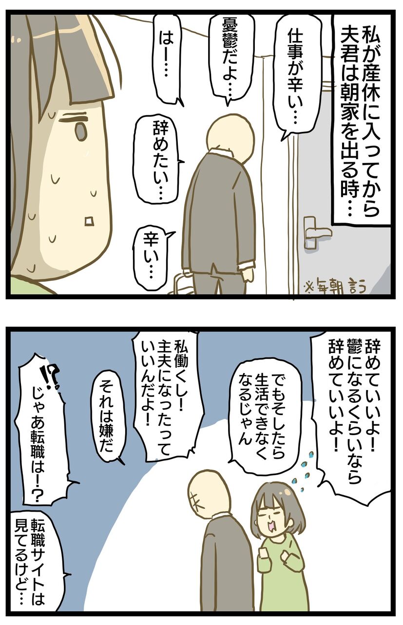 夫に毎朝会うのが辛かったです。「行きたくない、辛い、辞めたい」と、とにかくネガティブなことしか言わず鬱を本気で心配していました。「辞めていい!」と言っても主夫は嫌だと言うし転職をする気もないようで夫君がどうしたいのか、私にどう言って欲しいのかがわからずどうしてあげる事もできない。