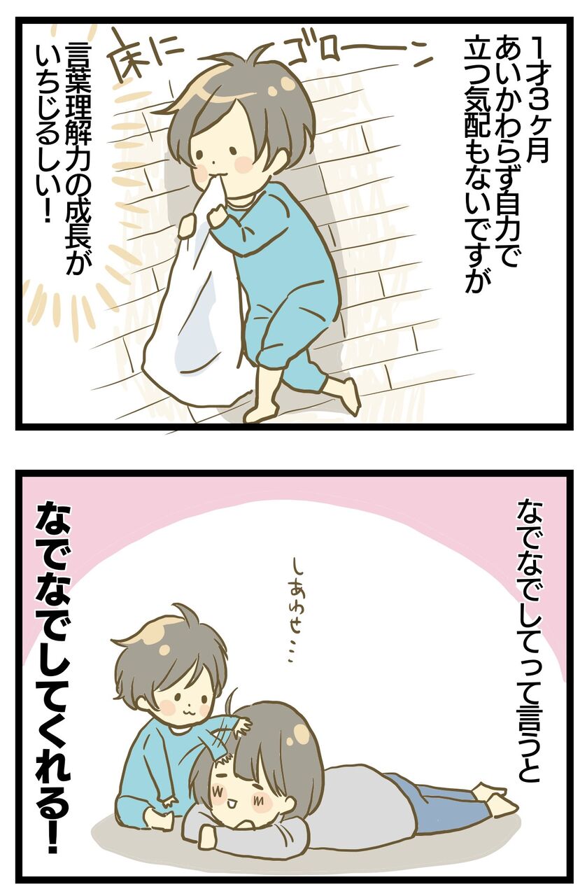 たまおの成長の話② 2022年04月24日 特になでなでしてがとても幸せになります。ものすごい癒し…!!!相変わらずフィジカルな成長はゆっくりでつかまり立ちから先に進んでませんがメンタルはだいぶ成長してる気がします!!妊娠悪阻で生き地獄な妊娠話はこちら 母乳ミルク問題はこちら 寝る赤ちゃんはこちら ワンオペ育児で夫と喧嘩した話はこちら 義実家帰省愚痴日記はこちら たまおのつかまり立ち奮闘記 ワンオペ育児の通院話はこちら 夫婦喧嘩の話はこちら 児童センターデビューの話はこちら 「絵日記」カテゴリの最新記事 タグ :#育児絵日記#漫画#実録漫画#コミックエッセイ#日常 < 前の記事次の記事 >