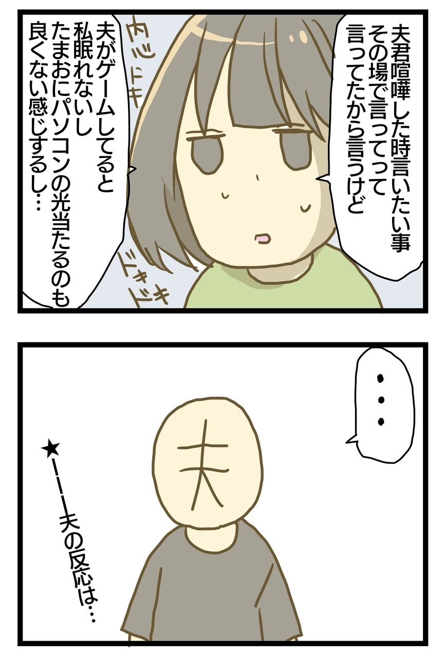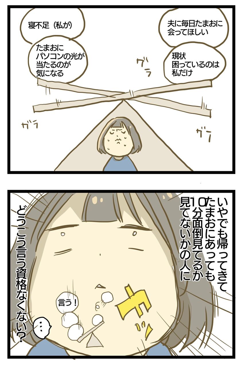 夫婦奮闘記⑦寝室の話3 2022年06月02日 この話の後日談になります。まだ完結していませんが暗い話ばかりがいやなので笑喧嘩をした後の奮闘を同時進行で描いていきます。前のお話はこちら 唯一の問題は夫がたまおに会えなくなる事でした。私的にもたまおがパパ嫌にならないよう、毎日会ってもらえるようたまおの寝床をリビングにしたりしていたのですがもはやそんなの気にしていられないくらい寝不足でした笑どっちにしても夫君がお世話してくれないならたまおがパパ嫌になろうと関係なくないか?と思ったり😂そして自分の意見を言うって苦手で夫君にこれ言う時内心ドッキドキしてました笑漫画にして見るとこれくらい言うだけで何がドキドキなのと思うんですがねーこのお話は現在連載中の「仕事が辛いと言う夫」 の後日談です。過去一の喧嘩をした後の夫婦の歩み寄りを描いていきます。 加齢臭・体臭・デリケートゾーン用 「パパこれ使って」消臭石鹸ビタミンC 600倍の抗酸化作用 OPC配合 男性から女性まで無添加・日本製 父の日 プレゼントPAPANOMIKATA次のお話はこちら 妊娠悪阻で生き地獄な妊娠話はこちら 母乳ミルク問題はこちら 寝る赤ちゃんはこちら ワンオペ育児で夫と喧嘩した話はこちら 義実家帰省愚痴日記はこちら たまおのつかまり立ち奮闘記 ワンオペ育児の通院話はこちら 児童センターデビューのお話 「育児絵日記」カテゴリの最新記事 タグ :#育児絵日記#漫画#実録漫画#コミックエッセイ#夫婦#夫婦喧嘩#夫婦奮闘記 < 前の記事次の記事 >
