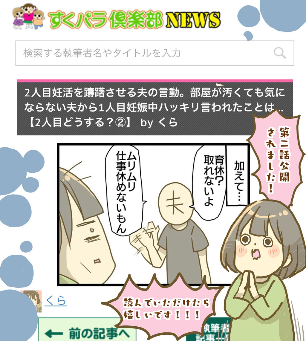 お知らせ 2022年09月16日 すくパラ様で第二話公開されました!スクパラでしか読めないお話となっておりますので読んでいただけると嬉しいです!どうぞよろしくお願いいたします。コチラから読めます!妊娠悪阻で生き地獄な妊娠話はこちら 母乳ミルク問題はこちら 寝る赤ちゃんはこちら ワンオペ育児で夫と喧嘩した話はこちら 義実家帰省愚痴日記はこちら たまおのつかまり立ち奮闘記 ワンオペ育児の通院話はこちら 児童館デビューのお話はこちら 妊娠と仕事の葛藤はこちら 「その他」カテゴリの最新記事 タグ :#育児絵日記#漫画#実録漫画#コミックエッセイ#夫婦 < 前の記事次の記事 >
