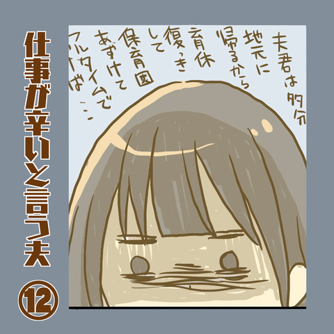 仕事が辛いという夫④ 最初から読む方はこちら 前のお話はこちら 睡眠が足りないと人間余裕がなくなっていくんだなーって。今までたまおはすごくよく寝てくれる子だったんですが夜泣きが始まりお昼寝時間も短くなり(それ自体は成長なので喜ばしいですが!)私にとってたまおの世話が1番大事でその ... 2022年04月10日 続きを読む